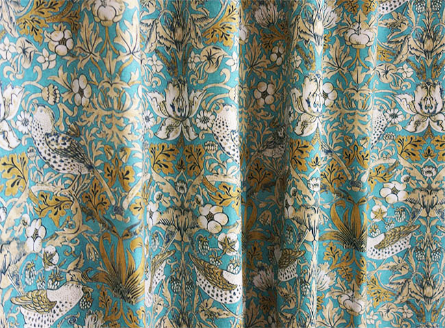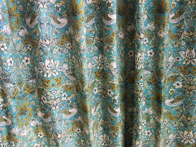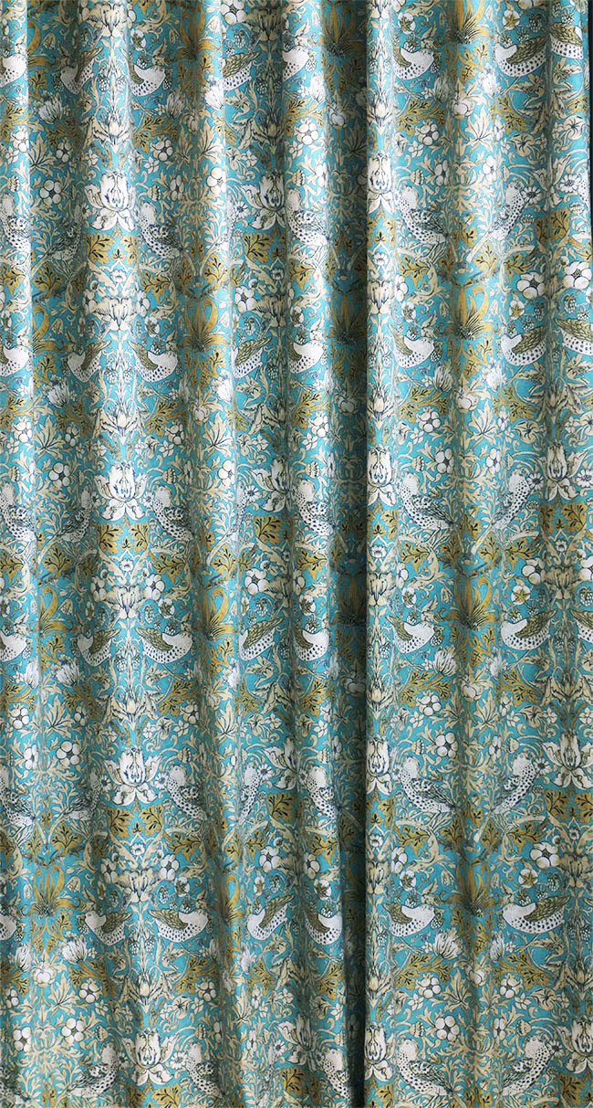 スペイン製のプリント生地を使用したオーダーカーテン「ヴィバルディ BL(水色)」は、ウィリアム・モリスの名作「いちご泥棒」をオリジナルカラーで表現。