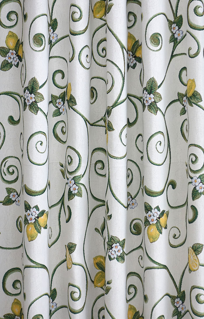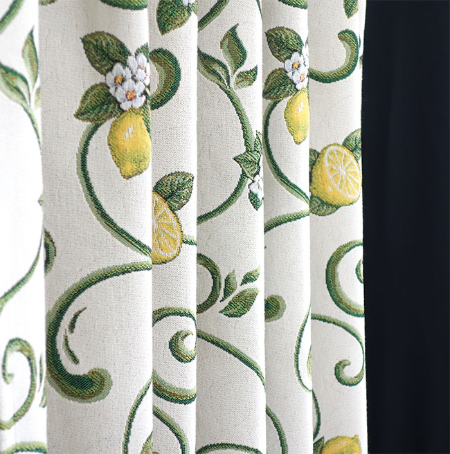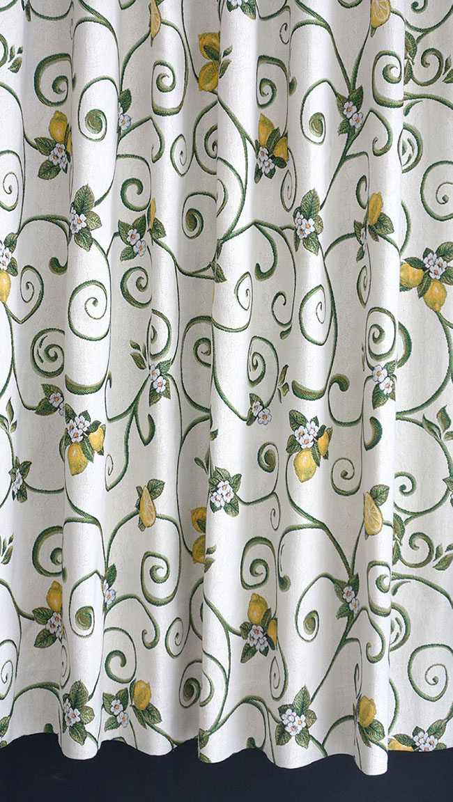 オーダーカーテン(ドレープ) スペイン製 レモン柄「キャスタ」 遮光3級 イエロー/グリーン/ホワイト 共布タッセル付き インポートカーテン