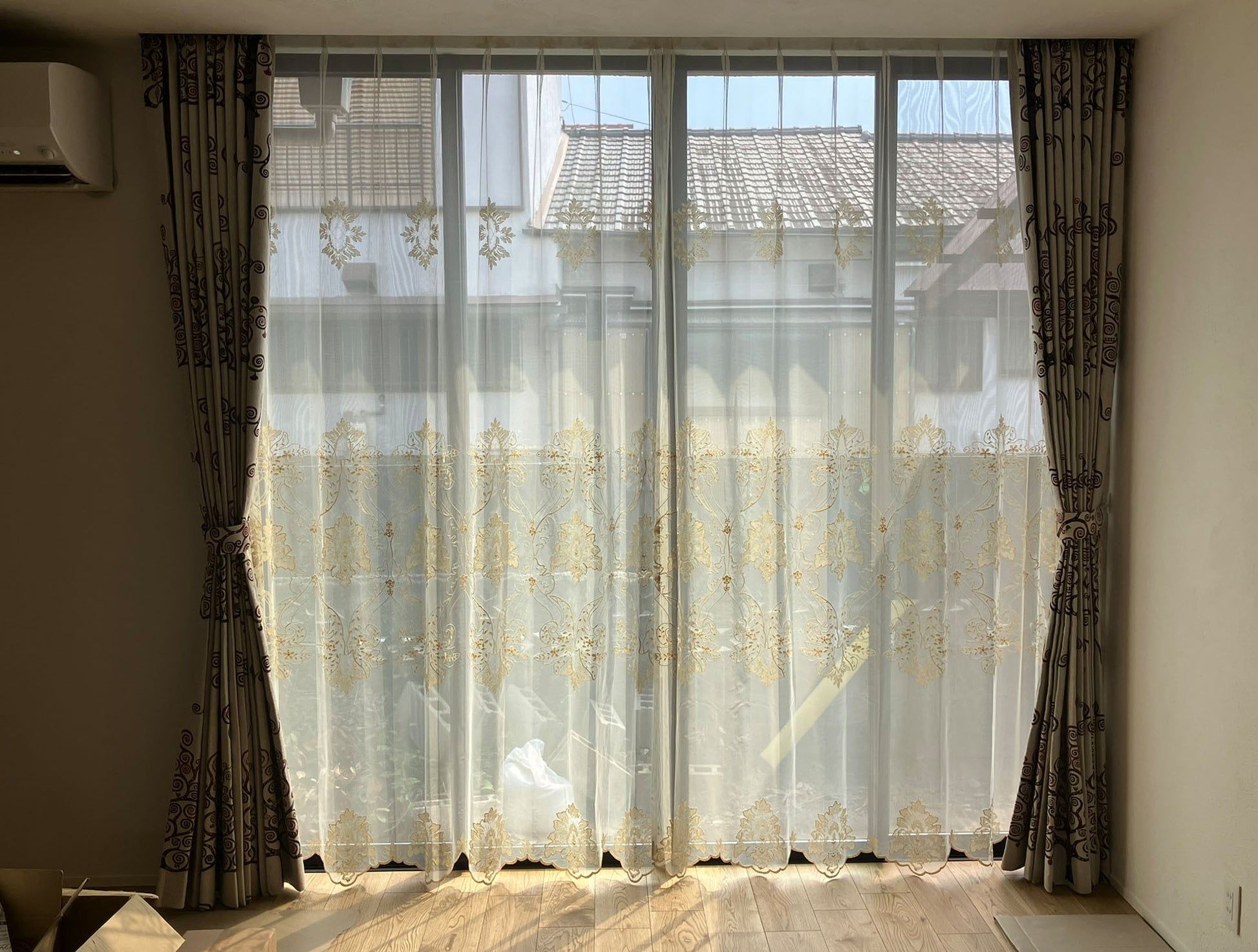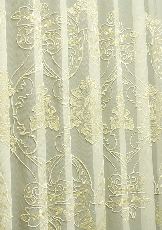 トルコ製の高級オーダーカーテン『エリザ』は、日本国内で丁寧に縫製されています。金刺繍が施された裾のヨーロッパ風豪華模様が、窓辺にエレガントな輝きを添えます。レース素材が柔らかく光を程よく通し、美しい陰影を演出。上質な仕上がりでお部屋の格をワンランクアップさせる一枚です。